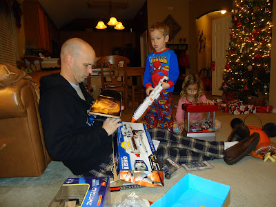 Look close and you can tell that Hudson came walking into the living room carrying his skateboard. Evidently he came and took a peek....and took his skateboard....before going into Lawson's room to get her and give us the signal! This was what he wanted most and I guess he just couldn't stand it! Pretty funny! (and typical of him these days!)