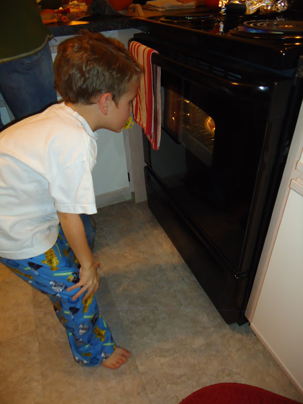 We roasted some pumpkin seeds. Hudson had heard some people at school talk about roasting and eating pumpkin seeds. He could hardly wait for them to come out!